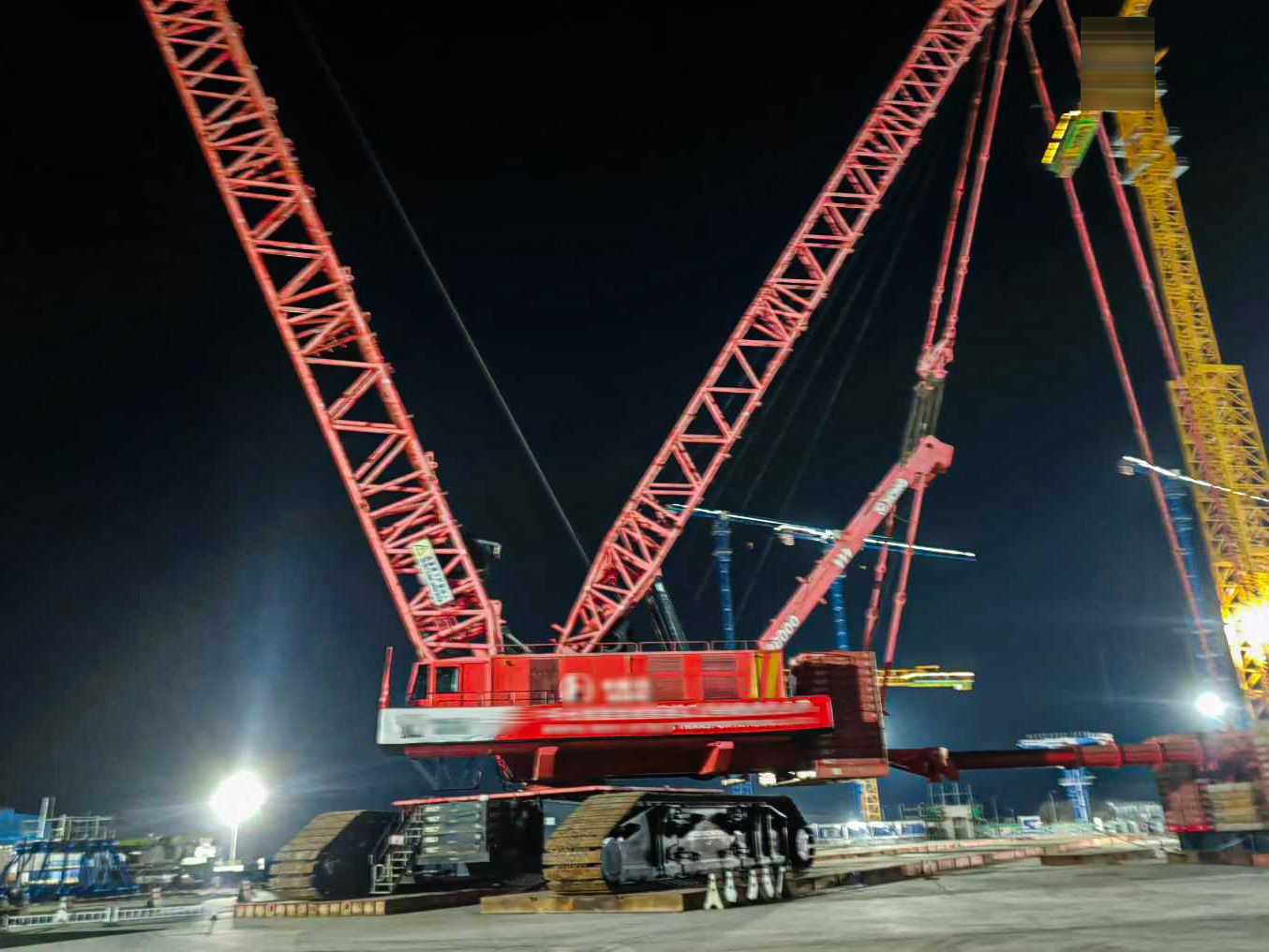 施工现场,XGC28000采用108米重型主臂,稳而有序地执行提升、旋转、带载行走等一系列高难度动作。