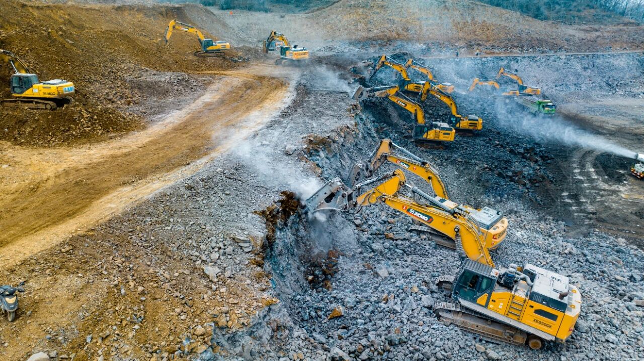 为确保工程顺利推进、抢抓冬季施工黄金期,施工方经过多次研讨优化施工方案,最终选定徐工挖掘机承担本次场平核心任务。目前,现场已陆续进驻14台徐工挖掘机,全面包揽山体玄武岩破碎及土石料装车等关键工序,全力攻坚约300万方的工程总量。据悉,滁州部分施工区域地质条件复杂,多为坚硬玄武岩,对施工设备的效率与可靠性提出极高要求,而徐工XE650GK等明星机型凭借出色性能成为攻坚主力。其中8台XE650GK搭配215破碎锤,依托独有的破碎多级调频控制技术,高效破解高硬度岩石施工难题,每日保底破碎玄武岩1500吨以上,轻料作业日产量可达2000至3000吨,且油耗控制在40L左右,实现高效与节能双赢;徐工380、335等机型则协同开展土石方挖装作业,搭配矿山专用铲斗,以灵活操作、稳定底盘和优异的挖装效率,成为施工现场的“得力干将”。