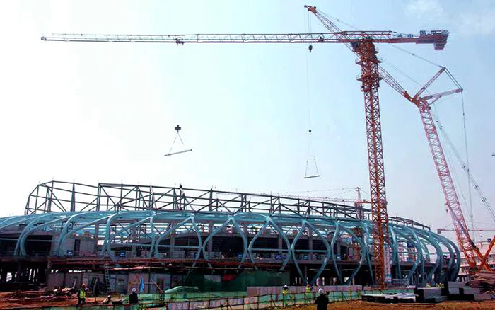 滁州奥体中心项目位于明湖景观区域,规划占地约1100亩,总建筑面积约13.4万平方米,主要建设项目为一场两馆、含全民健身中心和大型体育生态公园。徐工塔机多台XGT7022-12S产品参与滁州奥体中心项目建设,经过近一年的紧张施工,项目主体混凝土施工已基本完成,进入钢构吊装建设。