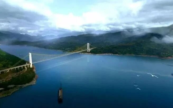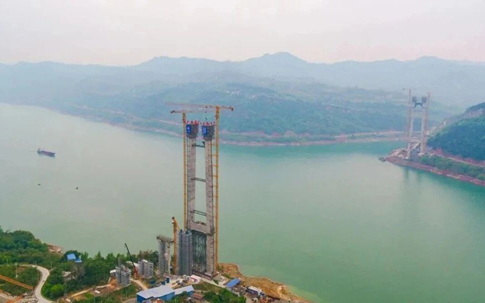 万州新田长江大桥是三峡库区在建跨度最大的双塔单跨钢箱梁悬索桥,大桥全长1.7公里,一跨过江,主跨1020米,是三峡库区继万利高速驸马长江大桥之后的又一座千米级悬索桥。