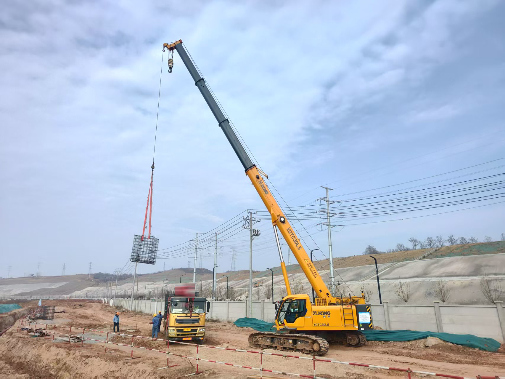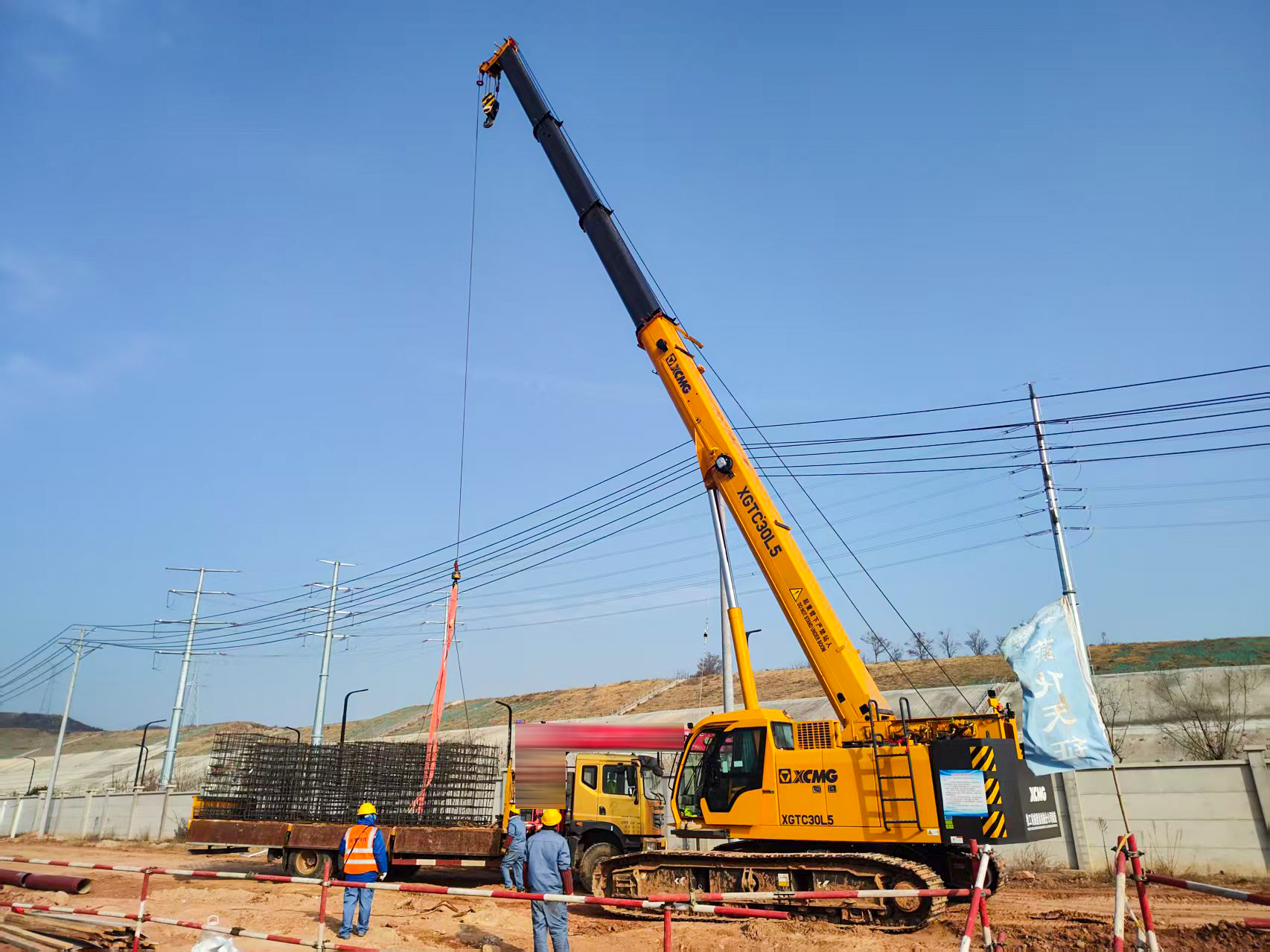 洛阳百万吨聚乙烯项目基础施工现场,XGTC30L5(30吨级)伸缩臂履带起重机正承担着关键工序——钢筋笼吊装。