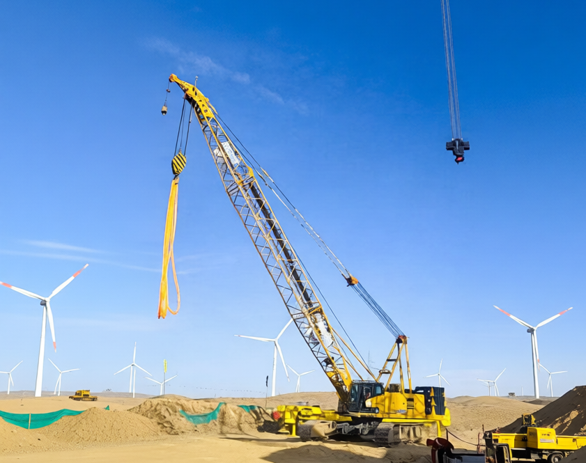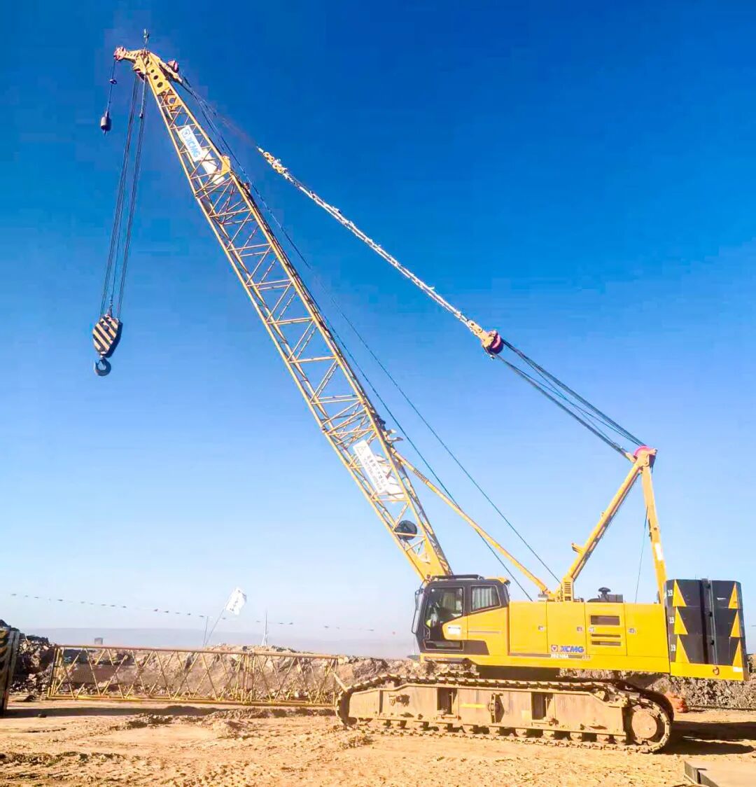 在宁夏山地风电场,XLC15000要吊起125米高的风机,第一步却得靠XGC100A(100吨级)履带起重机来“搭架子”。