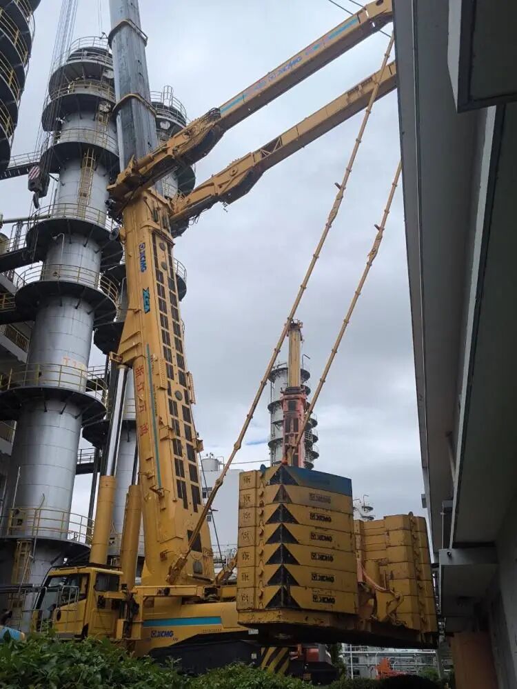 杭州某化工厂需在仅4米宽的通道内,为长40.5米、重140吨的氧化塔“搬家”。徐工部署了XCA300、XCA350、XCA600L8、XCA750组成的“特种小队”。