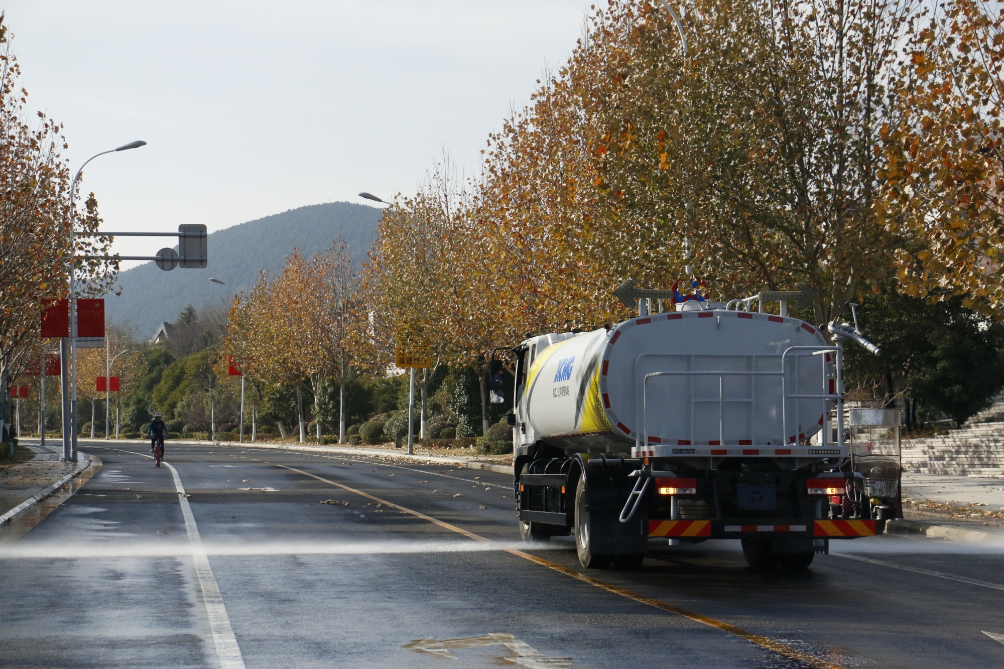 徐工洒水车在珠山路,开启高效作业模式。以10km/h的速度匀速行驶,强劲的水流精准覆盖路面,有效抑制扬尘。车辆操作灵活,作业过程平稳有序,为珠山路营造了清洁、舒适的环境。