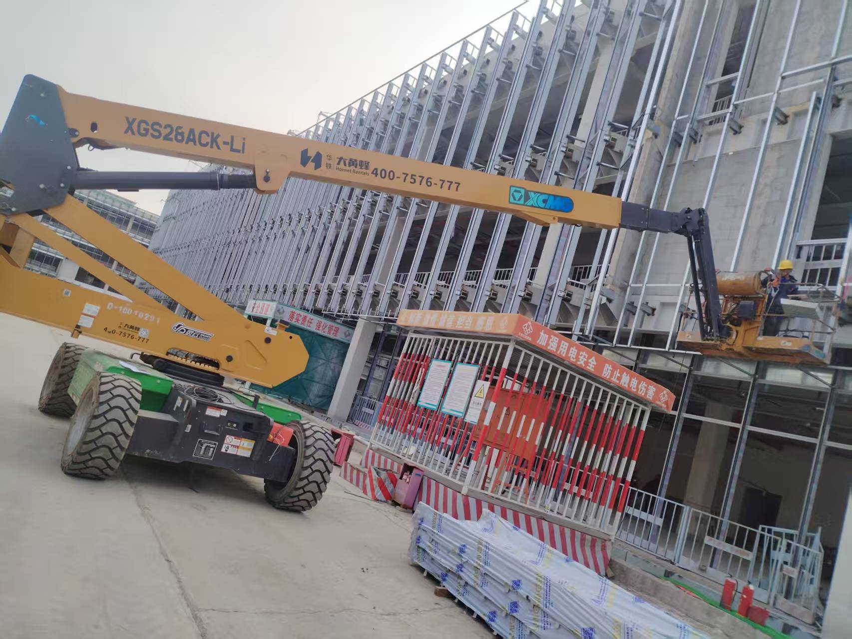 面对厂房外部钢结构焊接、装修装饰等复杂工况,XGS28ACK-Li能轻松跨越构件障碍,精准抵达钢结构顶端与幕墙边缘,为焊工和安装人员提供了灵活且稳固的作业平台。尤为突出的是,作为纯电动设备,它在施工中实现了零排放、低噪音,完美契合先导区对绿色施工的严苛标准。同时,其高效的能量管理系统保证了超长续航,配合精准的微动性能,让工人在高空进行精细焊接与装饰安装时如臂使指,大幅提升了工程整体进度。