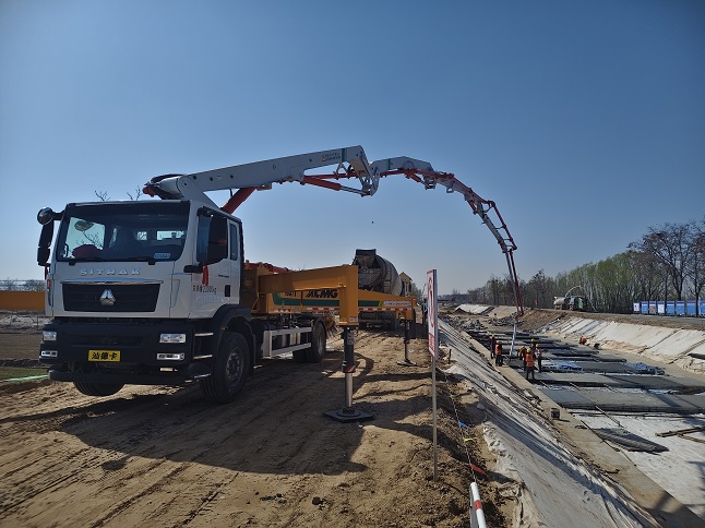 青铜峡灌区是宁夏引黄古灌区的重要组成部分,施工区域多位于田间地头和原有渠系旁,道路狭窄、作业面受限。HB37V凭借37米臂架、紧凑的整车设计,轻松进入施工点位,臂架伸展灵活,精准布料,以稳定的泵送性能和高效作业能力,连续完成浇筑任务,为春灌前工程顺利推进赢得了宝贵时间。