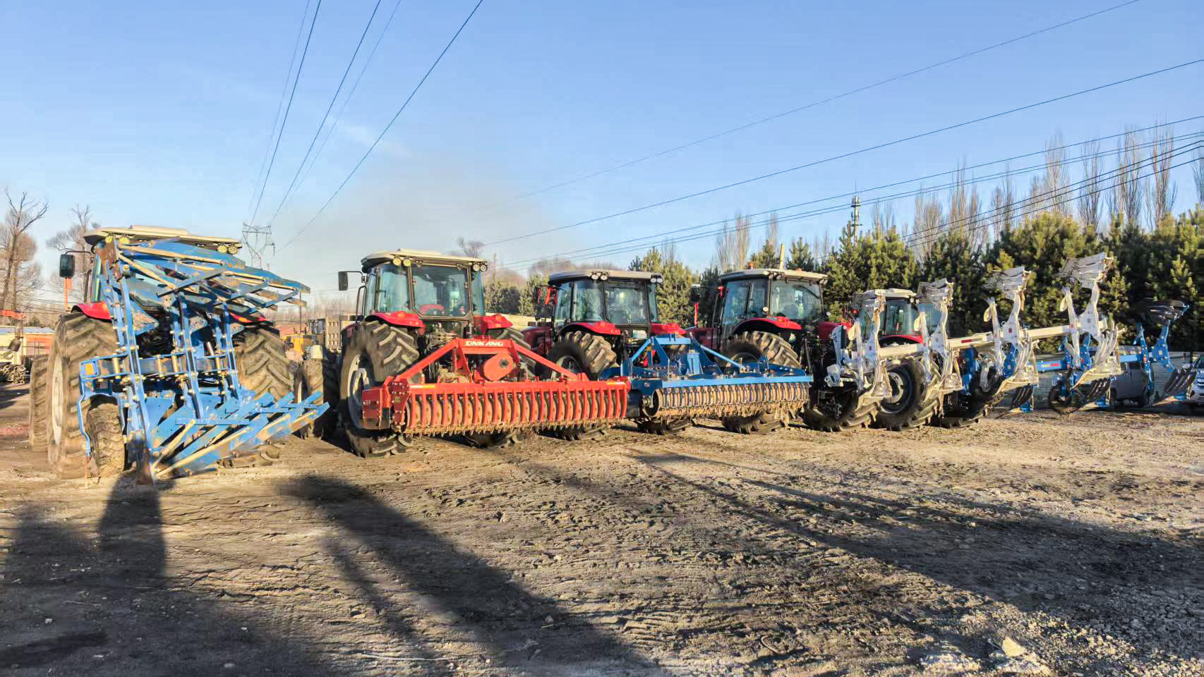 其中1台徐工2204-6DK大马力拖拉机,搭配液压翻转犁,以澎湃动力深翻沃土,每一次犁铧翻转都精准破茬、碎土、起垄,将深层土壤彻底唤醒,为作物扎根筑牢根基;4台徐工1604-6BK拖拉机,挂载驱动耙同步作业,耙齿高速运转,精准碎土、整平、保墒,一耙到位,让地块达到“地平、土细、墒足”的播种黄金状态。