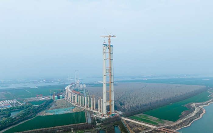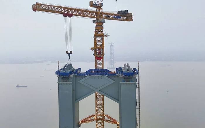 近日在国家“十四五”重点过江通道——张靖皋长江大桥南航道桥北主塔施工中